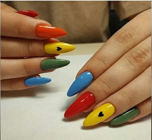 La conception des clous pointus atypique 2025-2026 peut être réalisée dans un style arc-en-ciel, faire des clous décoratifs avec des rayures, des mosaïques, des dégradés linéaires, ainsi que décorer des ongles aux couleurs vives avec des cœurs, des astérisques, des points individuels combinés dans la couleur.