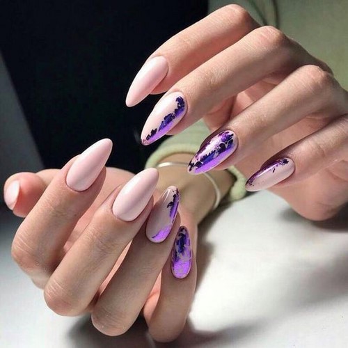 Vous pouvez obtenir des ongles pointus impressionnants 2025-2026 si vous montrez un intérêt pour les techniques du marbre, des gouttes de mercure, des yeux, des coups de pinceau, qui créent un aspect abstrait complexe des ongles.