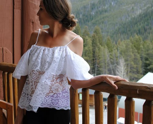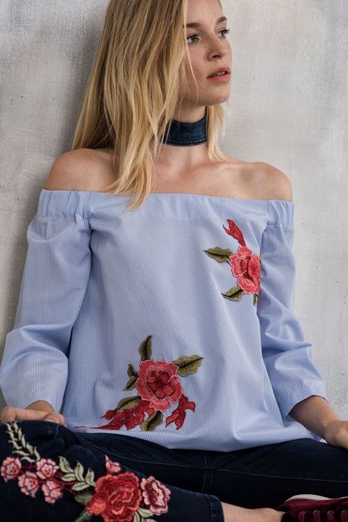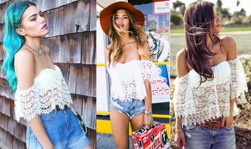 Bien que la tendance «épaules ouvertes» soit elle-même magnifique, même sans décor inutile, on trouve souvent des chemisiers et des hauts à épaules nues décorés de broderies, d'applications et de dentelles. Il est à noter qu’avec la dentelle un tel haut a l’air très élégant.