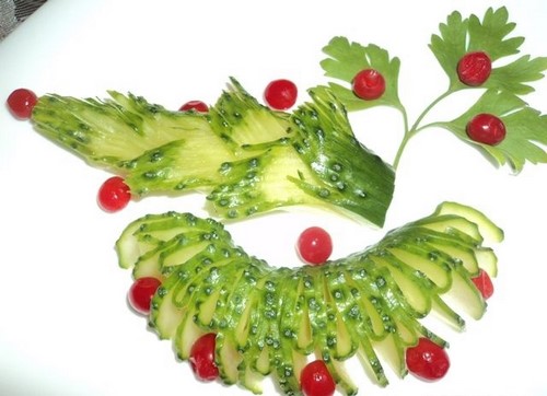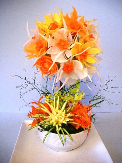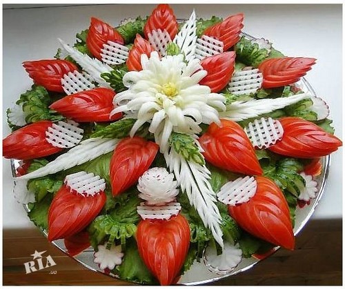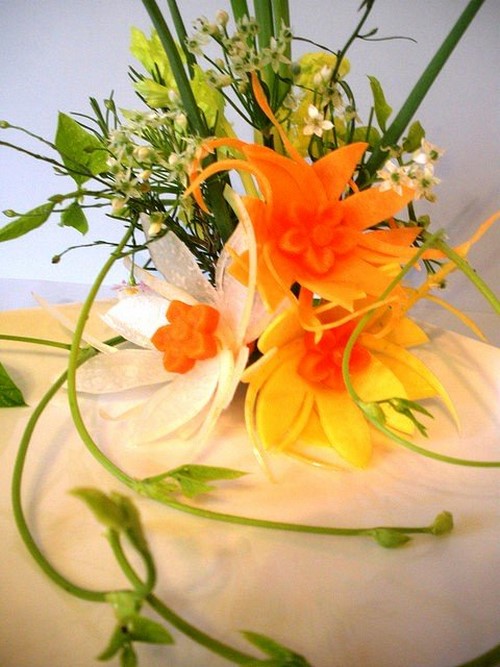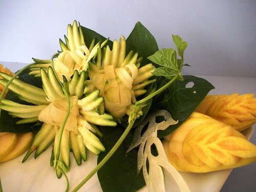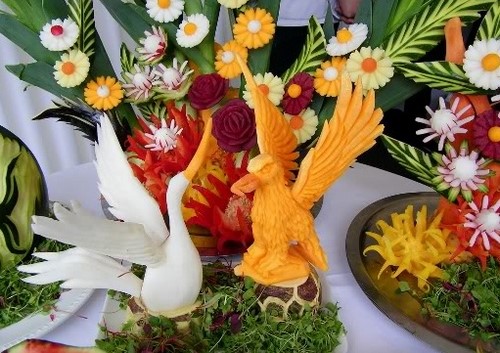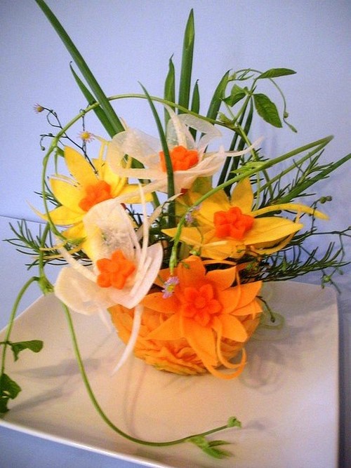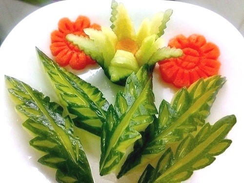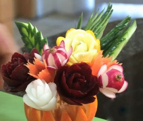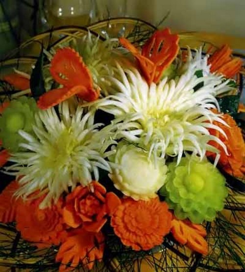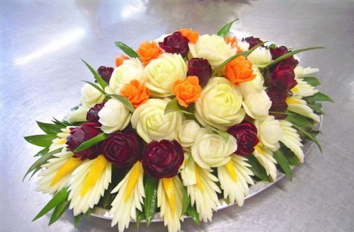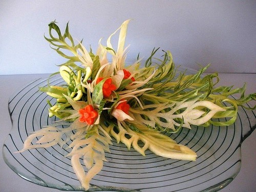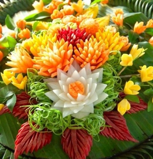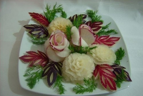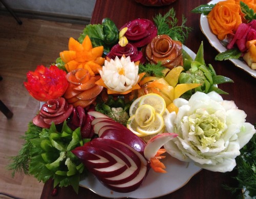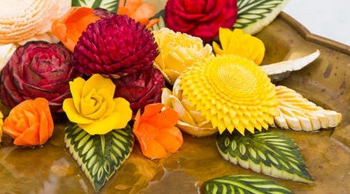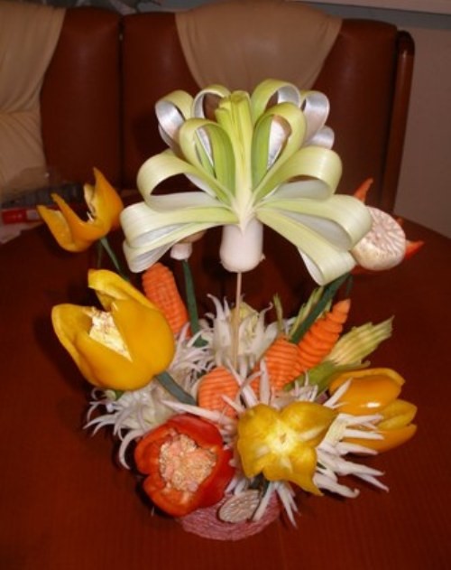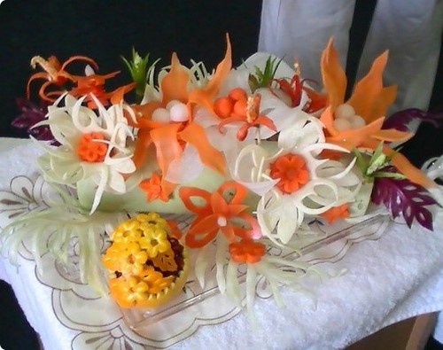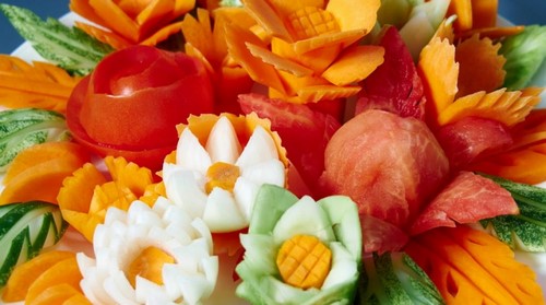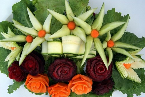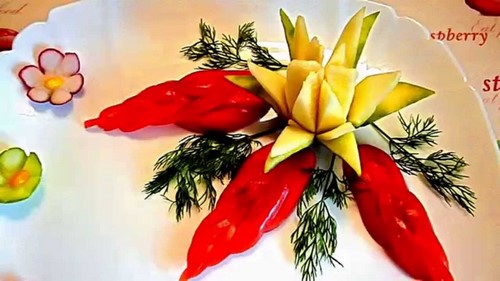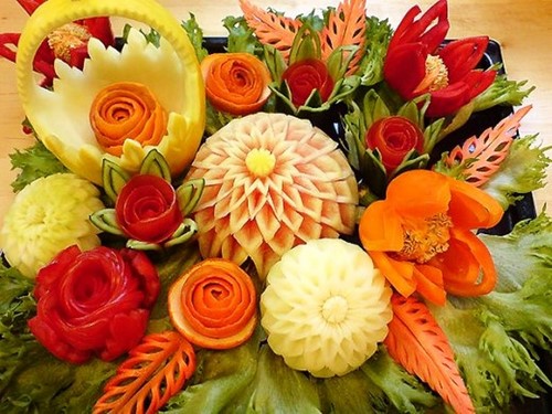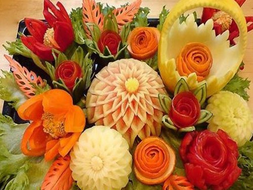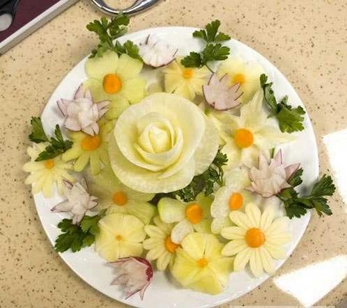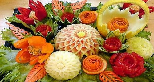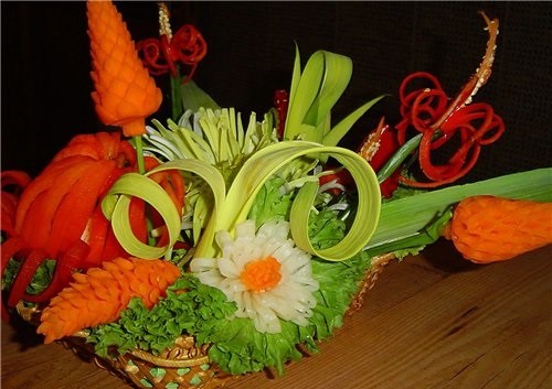 Le découpage de légumes figuré ou décoratif est souvent combiné au découpage de fruits, ce qui vous permet de créer des compositions de fruits et de légumes entiers.