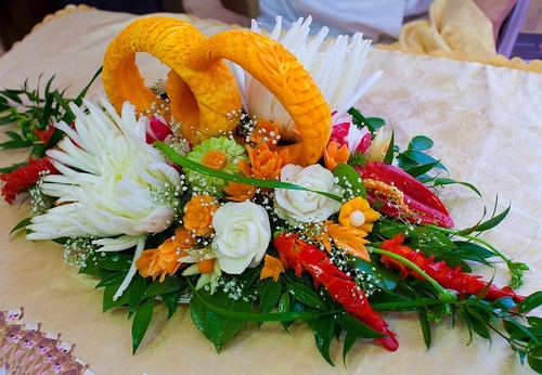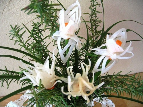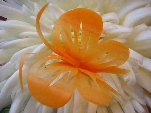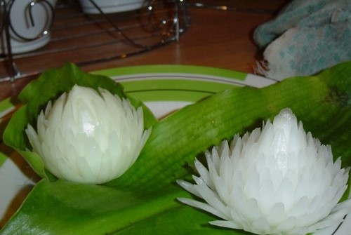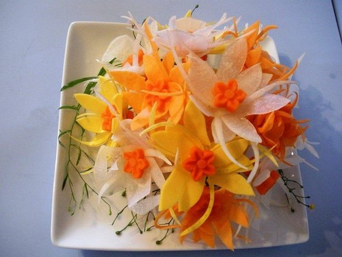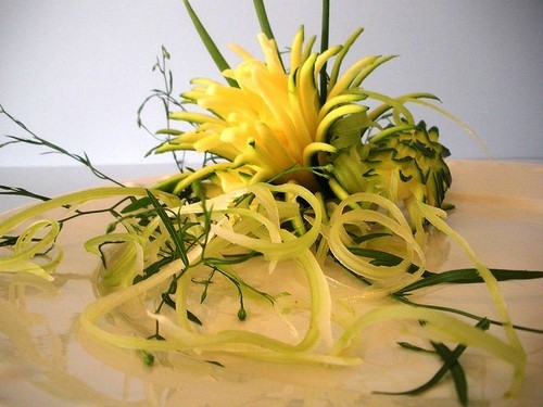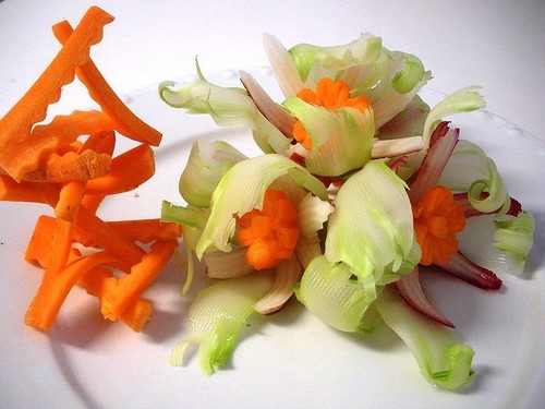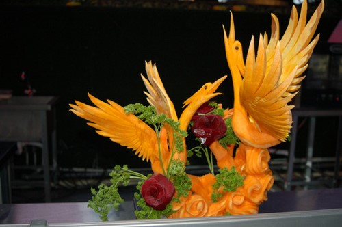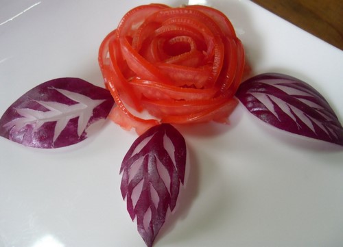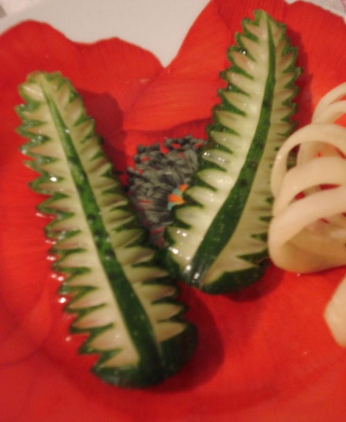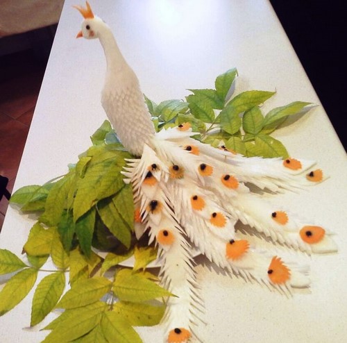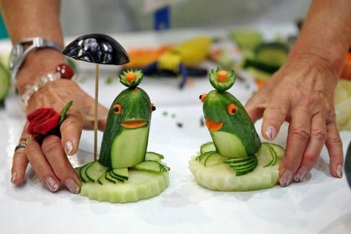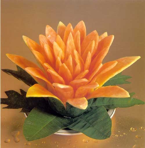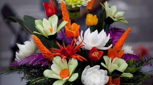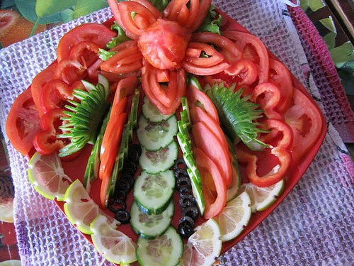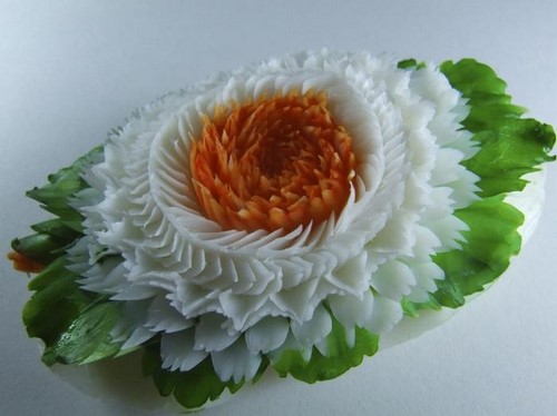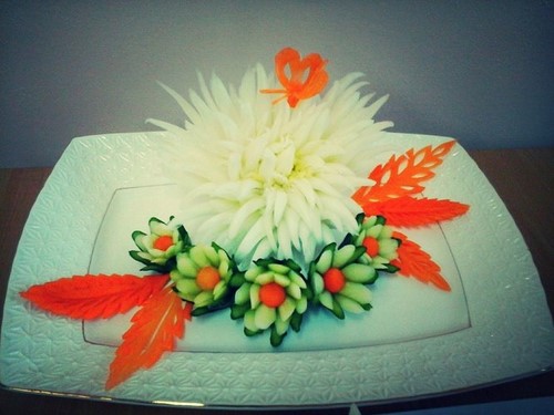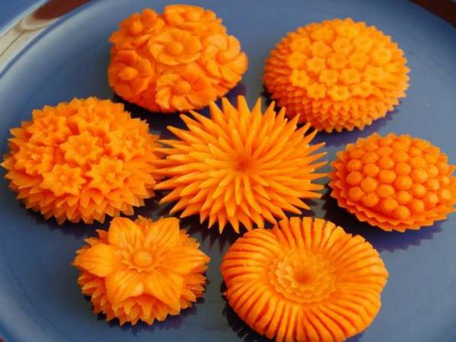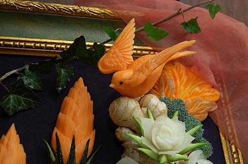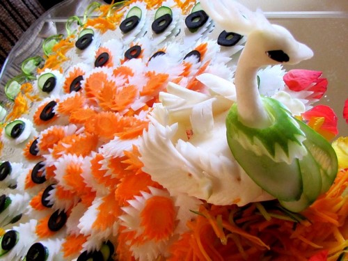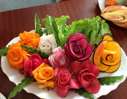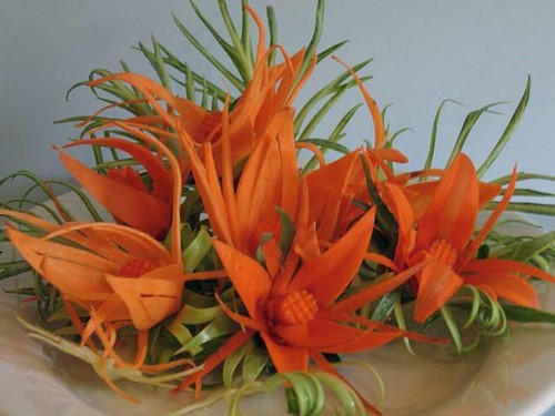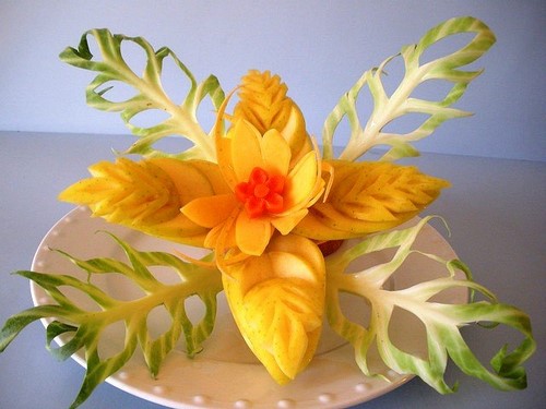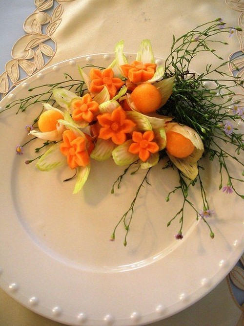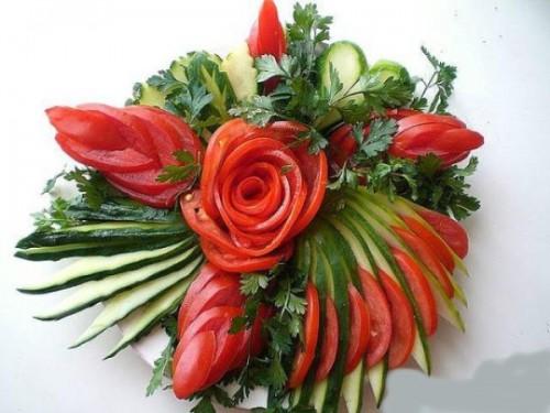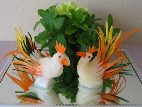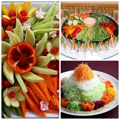 Le découpage de légumes figuré ou décoratif est souvent combiné au découpage de fruits, ce qui vous permet de créer des compositions de fruits et de légumes entiers.