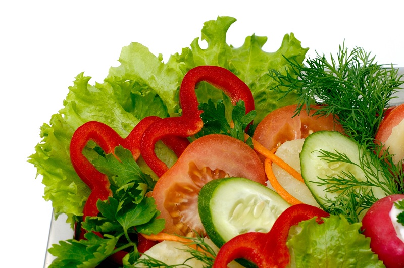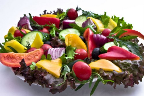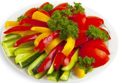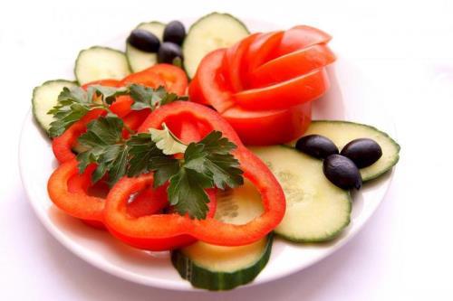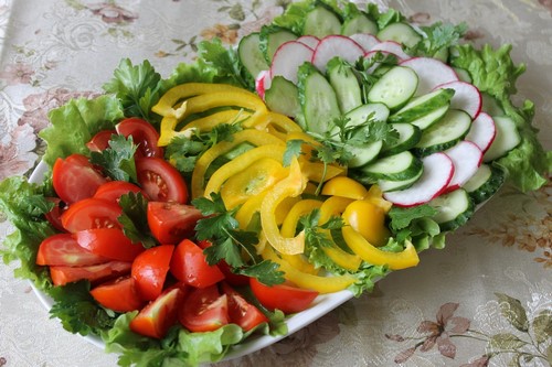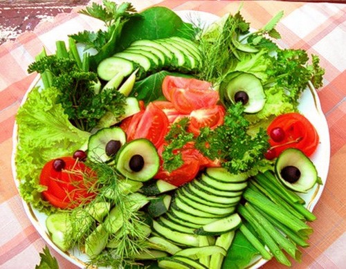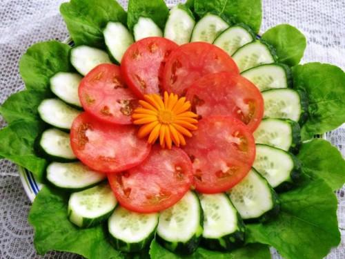 En outre, les légumes en tranches de légumes de différentes couleurs peuvent être placés sur des feuilles de laitue, des feuilles de chou. Les légumes en tranches dépliés sur un fond vert clair auront un aspect très esthétique.