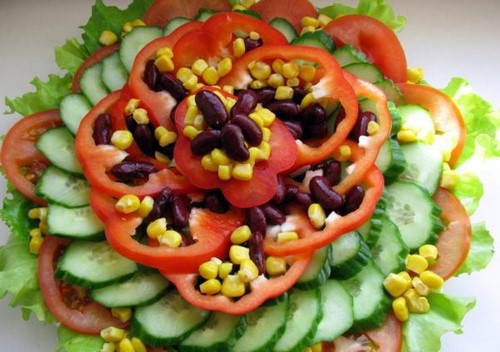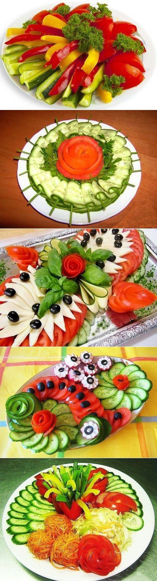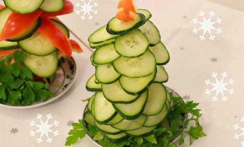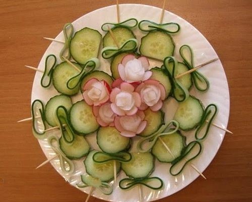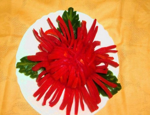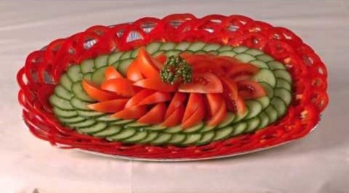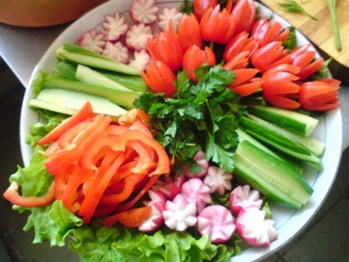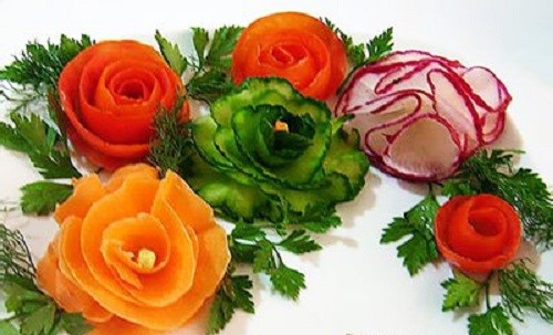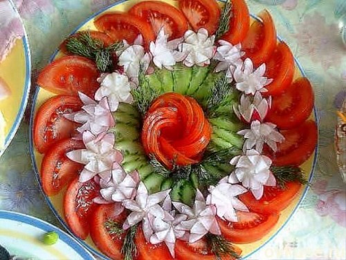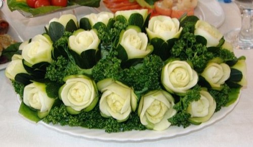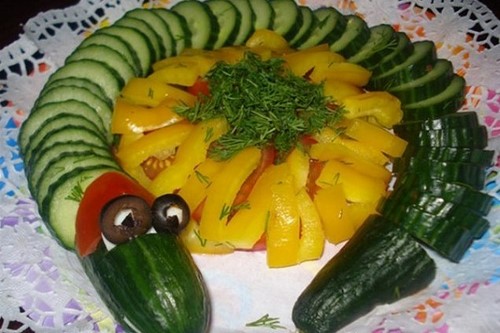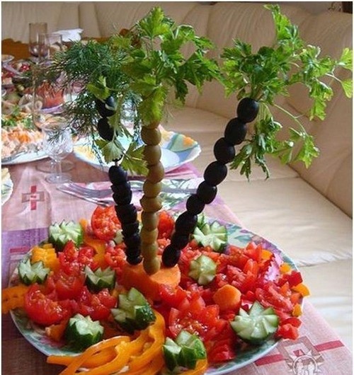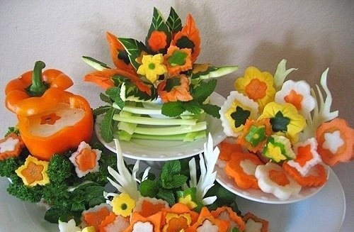 Pour que la découpe des légumes sur la table de fête soit vraiment originale, il est conseillé de couper les légumes de différentes manières, en les disposant selon un motif et une couleur déterminés.
