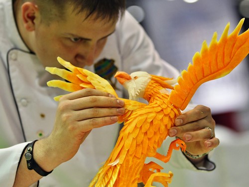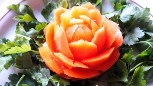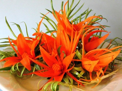 Le tranchage de légumes décoratif ou la découpe de légumes à partir de légumes doit être effectué à l'aide de couteaux tranchants, de préférence en acier, ainsi que d'autres outils de sculpture.