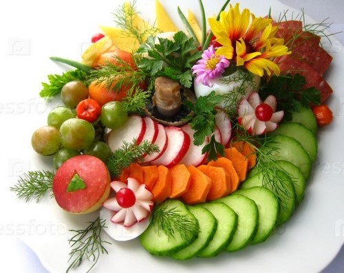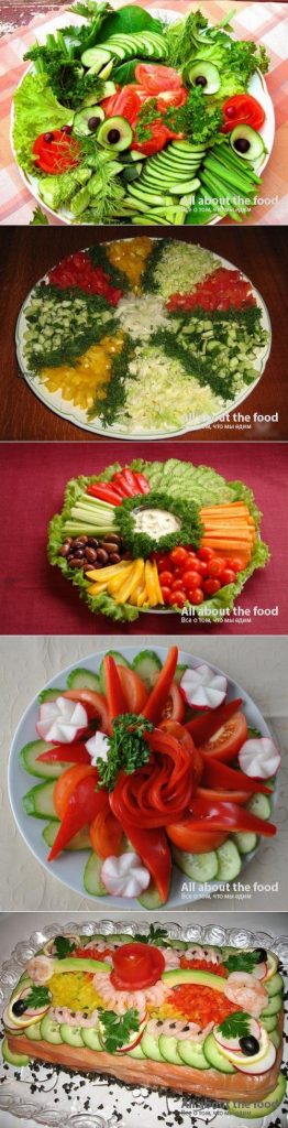 Et maintenant notre coupe de légumes, dont la conception est mieux faite en regardant des exemples. Coupe de légumes dans les options de photo brillantes. Vous trouverez ici beaucoup d’idées sur la manière d’arranger un légume coupé sur une table de fête.