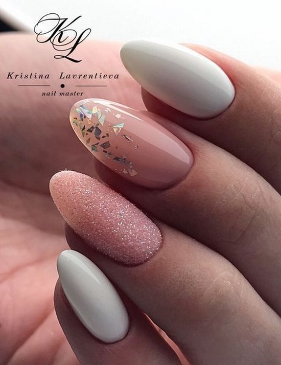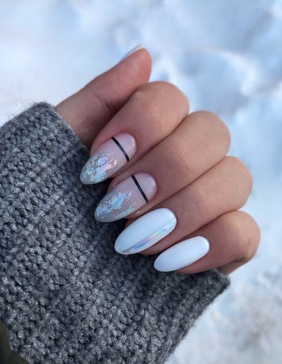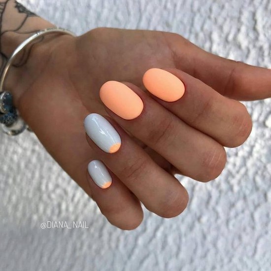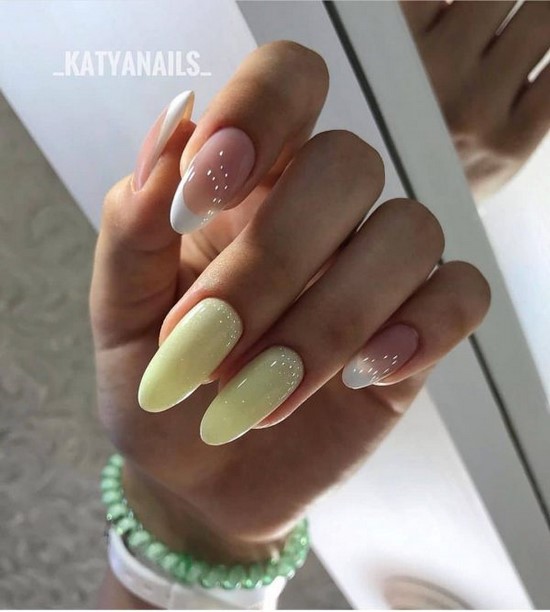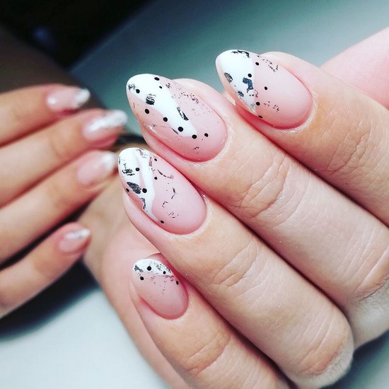 De plus, les ongles pastels mats et brillants avec des points en pointillés blancs intéresseront beaucoup de personnes, qui peuvent être arrangées sous la forme d'un trou, à la fois de manière abstraite et linéaire.