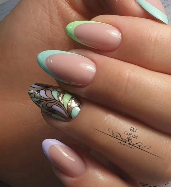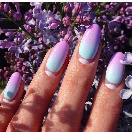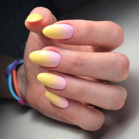 Ce n'est pas pour rien que nous avons décidé de partir précisément des variations ombrées et multicolores, car une manucure au pastel avec effets de dégradé et transitions multicolores semble très conceptuelle et réussie.