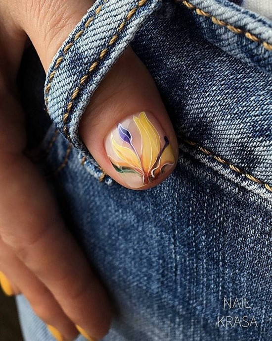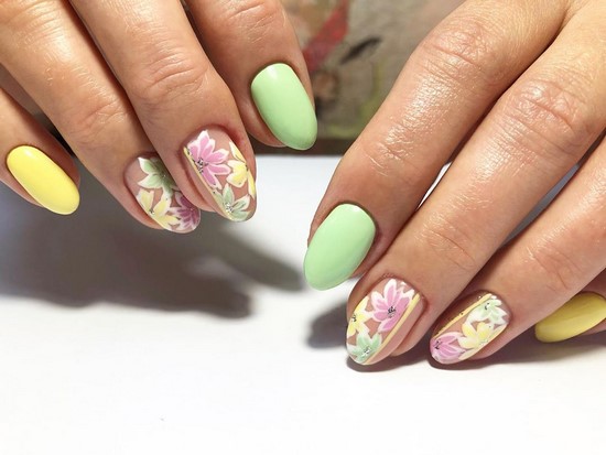 Si vous envisagez uniquement les ongles pastels, examinez-les de plus près avec des fleurs, qui peuvent à la fois contraster et assombrir les tons atténués des pastels.