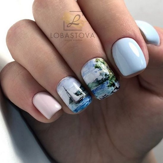 Ne perdez pas de vue la conception actuelle des ongles pastels dans un style marin, où il y a des détails du sujet.