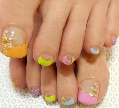 Pour créer un magnifique design de pédicure, des sourires peints sur les ongles, des trous surlignés, un style classique, multicolore, un français combiné et un marquage vous aideront.