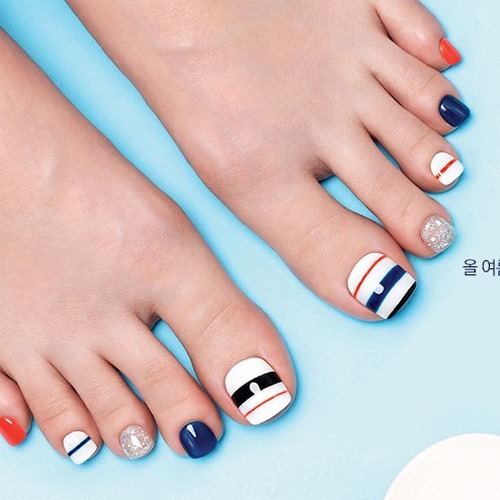 Pédicure à la mode discrète et charmante avec des rayures, des lignes, des zigzags - l’incarnation parfaite du minimalisme dans la conception des ongles des pieds.