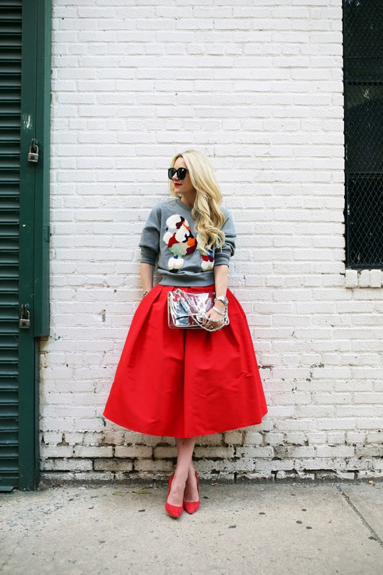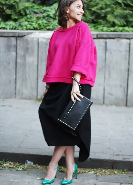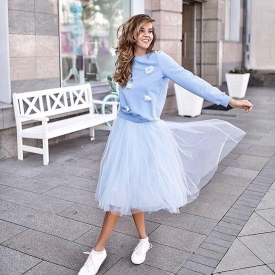 Les pulls molletonnés en tandem avec des types de jupes concis ont l’air particulièrement insolite, en particulier une jupe crayon, une jupe évasée, un modèle en jean, avec une odeur.