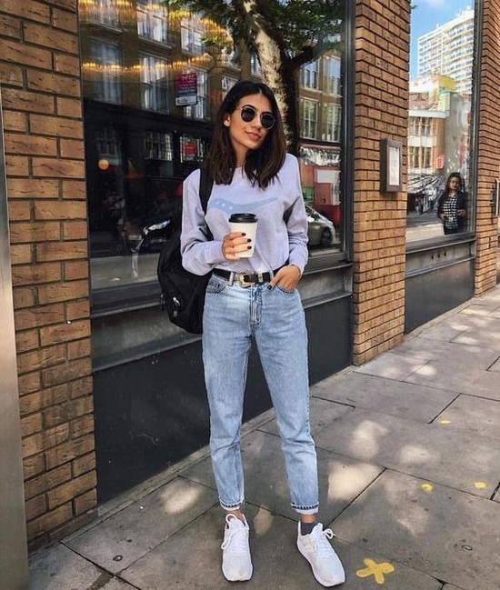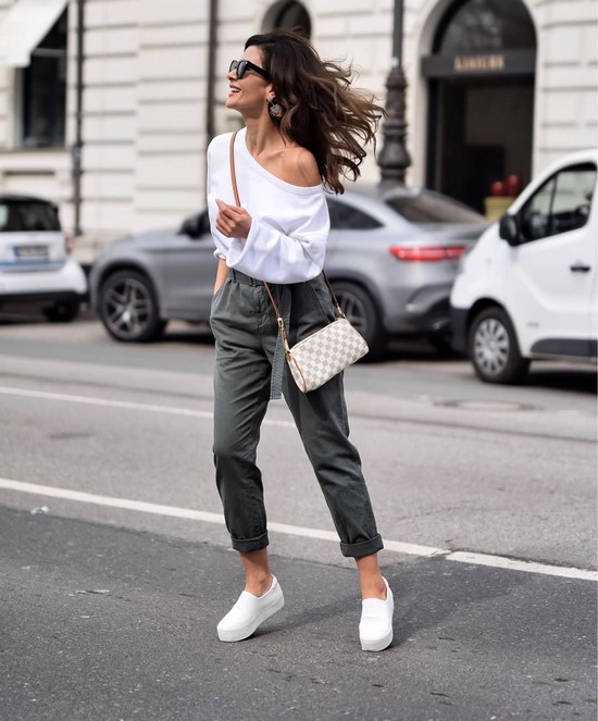 Si vous ne savez pas comment et quoi porter un sweat-shirt, n'oubliez pas de chaussures. Vous obtiendrez des images de la jeunesse si vous complétez l’arc avec des chaussures à faible course - style sportif ou militaire.