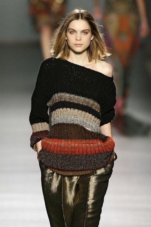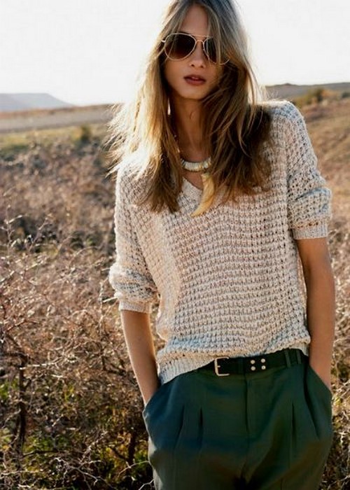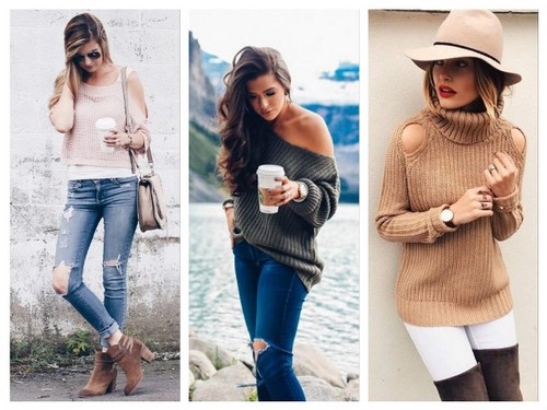 Les chandails tricotés en fait, un élément de la garde-robe qui ne nécessite pas de détails supplémentaires, mais vous pouvez toujours souligner la taille dans l'image avec un pull tricoté avec une ceinture.
