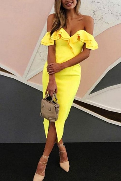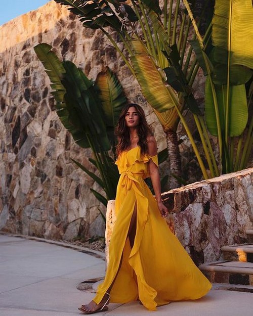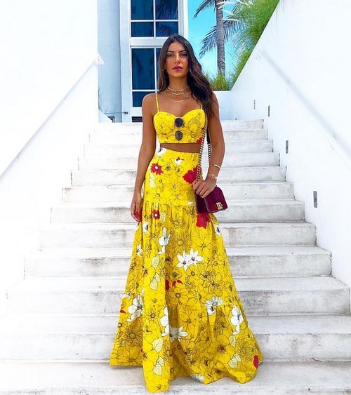 Modélisez des noeuds plus élégants en tandem avec des robes de dentelle jaune, avec des volants, des volants, des jupes en mousseline volantes et des chaussures à talons hauts.