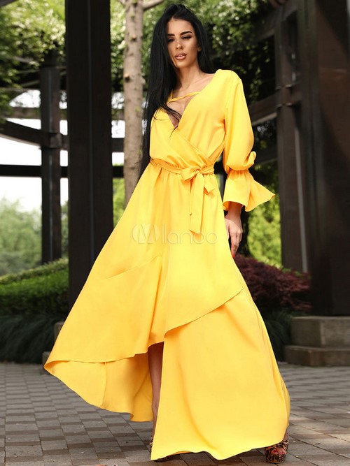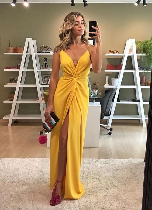Bien que les teintes jaunes deviennent très rarement les héros des tenues du soir, néanmoins, on trouve souvent des robes jaunes au sol dans des innovations étonnantes et des exclusivités de ce type se retrouvent souvent sur les silhouettes de personnages stellaires et de personnalités sociales, ainsi que de blogueuses de mode.