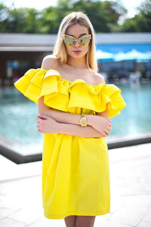 Des robes jaunes sont apparues à plusieurs reprises avec des robes jaunes avec des asymétries de la partie supérieure sur une épaule, des images jaunes dans des interprétations séduisantes, où certaines parties du corps sont exposées, de magnifiques robes jaunes avec des jupes excitantes et volantes.