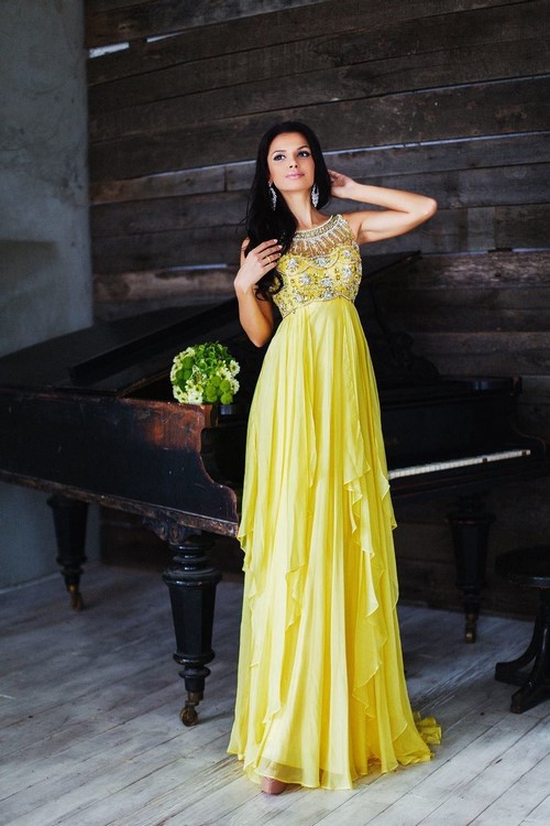 Godet, bustier, plissé, empire, style grec - tous les styles les plus simples seront sans aucun doute à leur meilleur niveau si vous décidez de porter une tenue de soirée jaune.