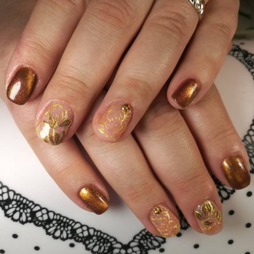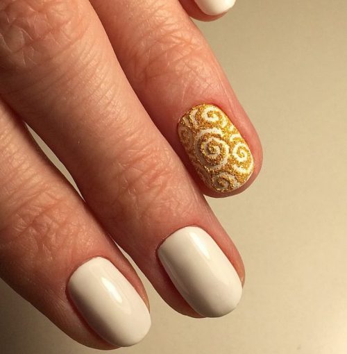 Vous pouvez appliquer une manucure dorée à l’aide de tels vernis sur tous les ongles, en décorant l’un d’eux avec un équipement radicalement différent.