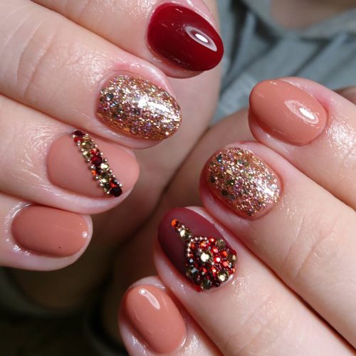 Une manucure avec de l’or sous forme de perles est le plus souvent interprétée comme un accent qui fait partie de la composition générale du dessin de vernis gel bordeaux, rouge, noir, beige et or.