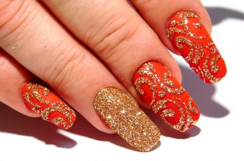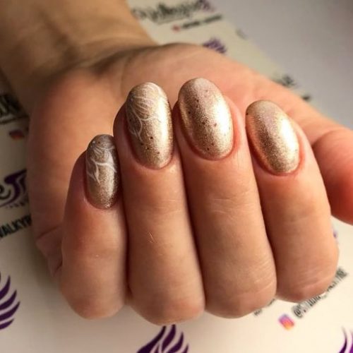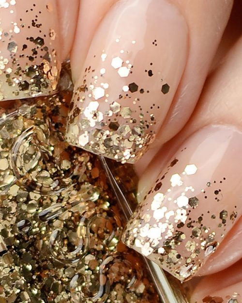 La prochaine tendance qui caractérise la manucure dorée est la conception des ongles, l’effet vacillant qui crée des particules brillantes et des confettis.