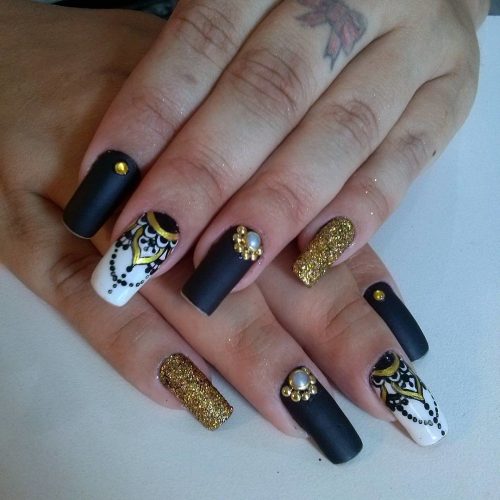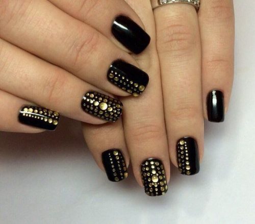 Les strass peuvent également contraster avec le revêtement sombre des soucis, en complétant des perles, des motifs de dentelle en or, une peinture de pois charmante.