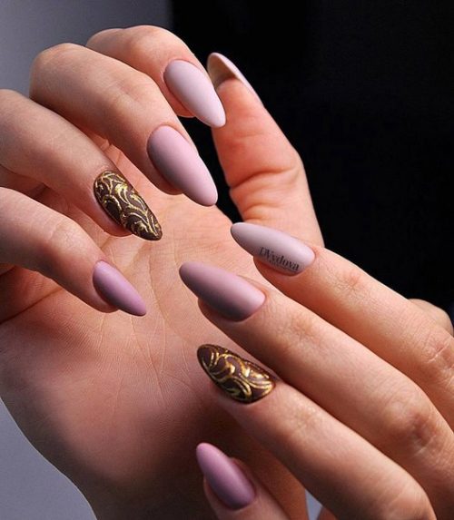 Vous pouvez essayer une manucure avec de l’or où, à l’aide d’étincelles et de rayures lumineuses kamifubuki, des points, des motifs ajourés, de superbes personnages dorés, etc., apparaîtront sur vos ongles. Des exemples de tels modes de réalisation sont présentés ci-dessous.